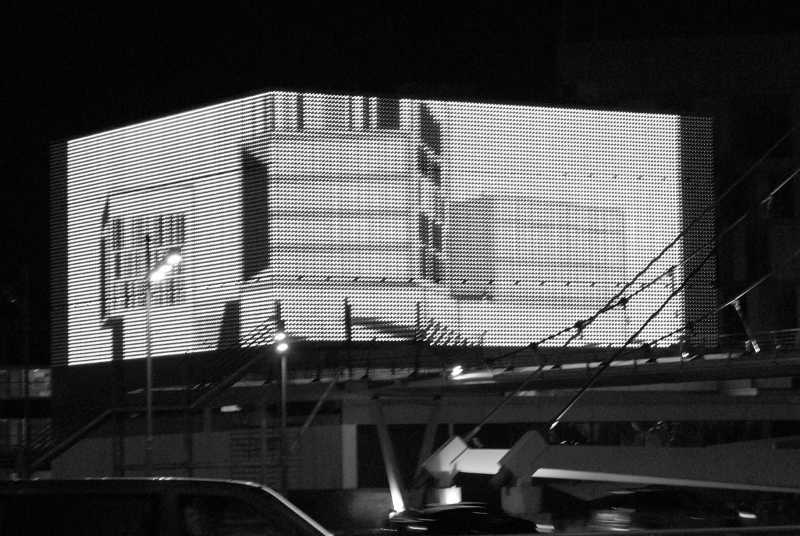 Veinte minutos después llegamos al lugar. Hay dos policías, un par de compañeros, un grupo de vecinos paseando a los perros, y Néstor Lizalde, artista multimedia zaragozano. Parece que ha sido todo una falsa alarma. Algo ha debido de disparar la sirena anti-incendios. Reseteamos el cuadro de alarmas y todo vuelve al silencio. Con otro miembro del equipo damos una vuelta por el edificio para asegurarnos de que todo está tranquilo. Antes de salir, nos pasamos por el taller de Néstor para despedirnos. Se levanta un momento y vuelve a encorvarse sobre el ordenador desde el que maneja la inmensa fachada de LED, un gran faro digital que da la bienvenida a todo aquel que entra desde el oeste a Zaragoza. Por los cristales de su cuarto vemos los faros de los coches pasar. Un poco más allá, las luces de la vecina estación.